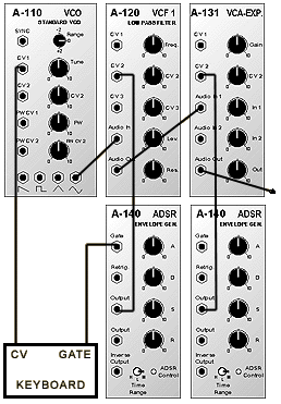 Basic -one voice- synthesizing patch. The audio signal begins at the oscillator and flows from left to right: through the MOOG filter and the VCA and then to the output. The KEYBOARD puts out two control signals: a voltage that controls the oscillators pitch and a gate (trigger) that tells both envelopegenerator (below) to begin creating their own transient voltage*. The voltage from the envelope generator* (downleft) controling the VCF cut-off frequency (FcM) and tells the Voltage controlled filter how to shape and pass parts of the audio spectrum. The VCA is controlled by the second envelopegenerator (downright). The envelopegenerator delivering a control signal* and thus opening up the VCA passing the signal to the output. The overall effect of volume is here determined. *ADSR is the signal generated by the envelopegenerator. |